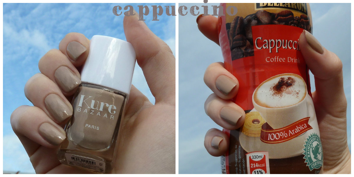 После темных лаков моим глазам обязательно нужен отдых и на помощь приходят лаки спокойных оттенков, на этот раз речь пойдет об очень красивом nude от Kure Bazaar Cappuccino. В моей коллекции много подобных лаков, но все они то на пол-тона темнее то светлее, а вот такого, чтобы прям идеально сливался с оттенком моей кожи не было! Cappuccino - действительно напоминает этот вид кофе, кофейно-молочный оттенок.